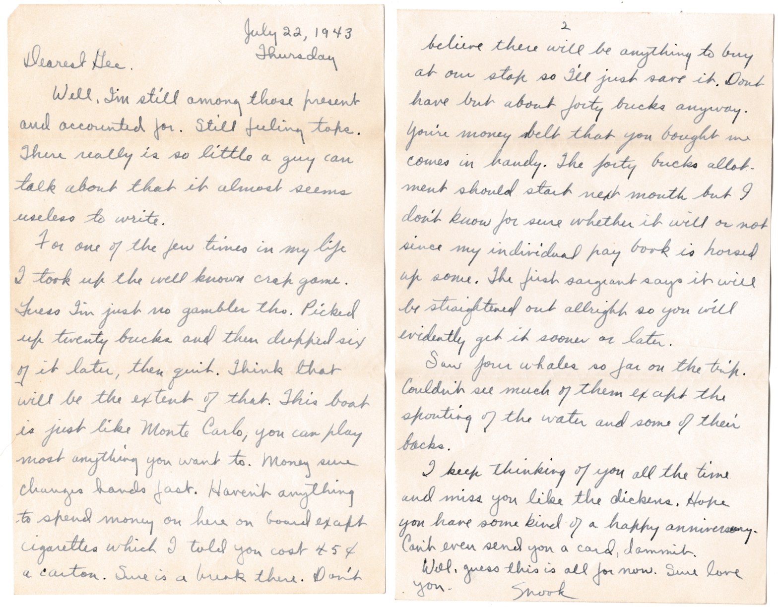 For one of the few times in my life I took up the well known crap game. I guess I’m just no gambler tho. Picked up twenty bucks and then dropped six of it later, then quit. Think that will be the extent of that. This boat is just like Monte Carlo, you can play most anything you want to. Money sure changes hands fast. Haven’t anything to spend money on here on board except cigarettes, which I told you cost 45¢ a carton. Sure is a break there. Don’t believe there will be anything to buy at our stop so I’ll just save it. Don’t have but about forty bucks anyway. Your money belt that you bought me comes in handy. The forty bucks allotment should start next month but I don’t know for sure whether it will or not since my individual pay book is horsed up some. The first sergeant says it will be straightened out alright so you will evidently get it sooner or later.