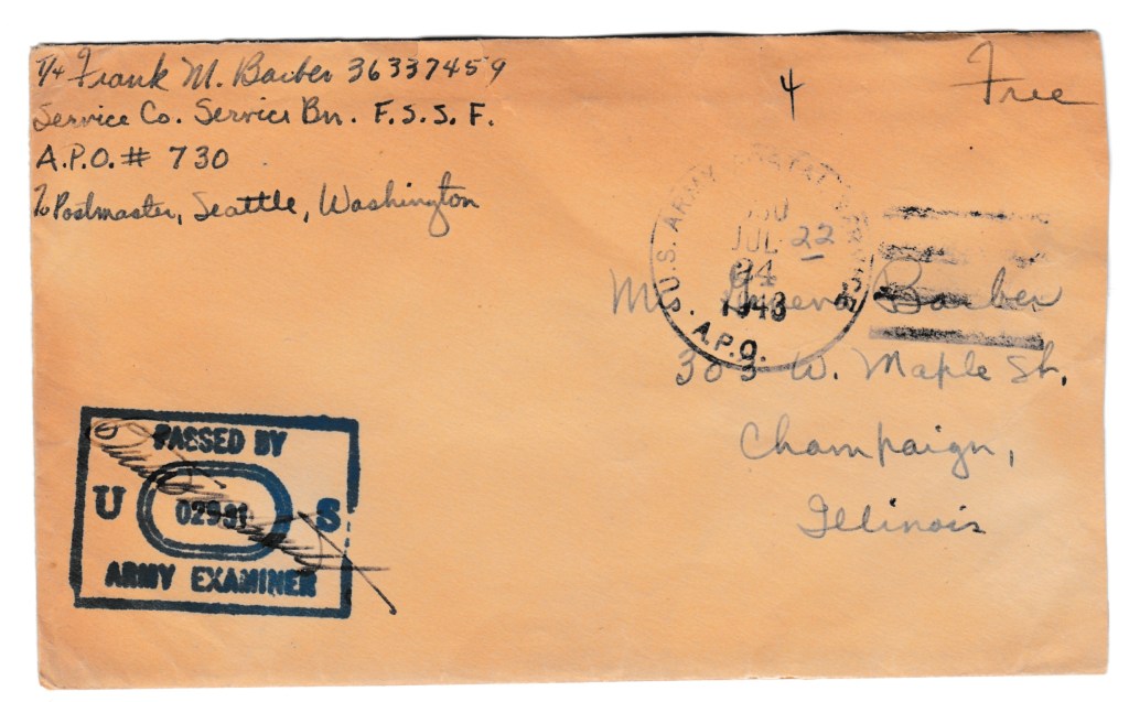 The prolific gambling on the boats and at the Amchitka encampment in the Aleutian Islands is well-attested in the Burhans and Adleman/Walton’s books, both mentioning the cautionary tale of “Sugar” Kane who legendarily won somewhere between $1000 and $10000 then buried it in a can under his tent on Amchitka, only to leave it hidden there after deploying for Kiska (Burhans pp 66; Walton pp 99). The boats landed at Amchitka Island in Alaska two days after this letter was written.