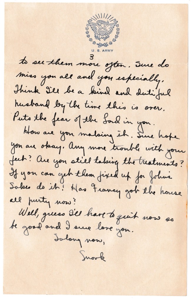 Well, honey, guess it’s about time I was writing you again. Still don’t have much to tell tho. Am still in the best of health and getting plenty of good eats. Don’t get a whole hell of a lot of sleep tho which is about the biggest drawback. They sure pile on the work around here, but I guess it’s necessary. Will sure be glad when this damn thing is over.