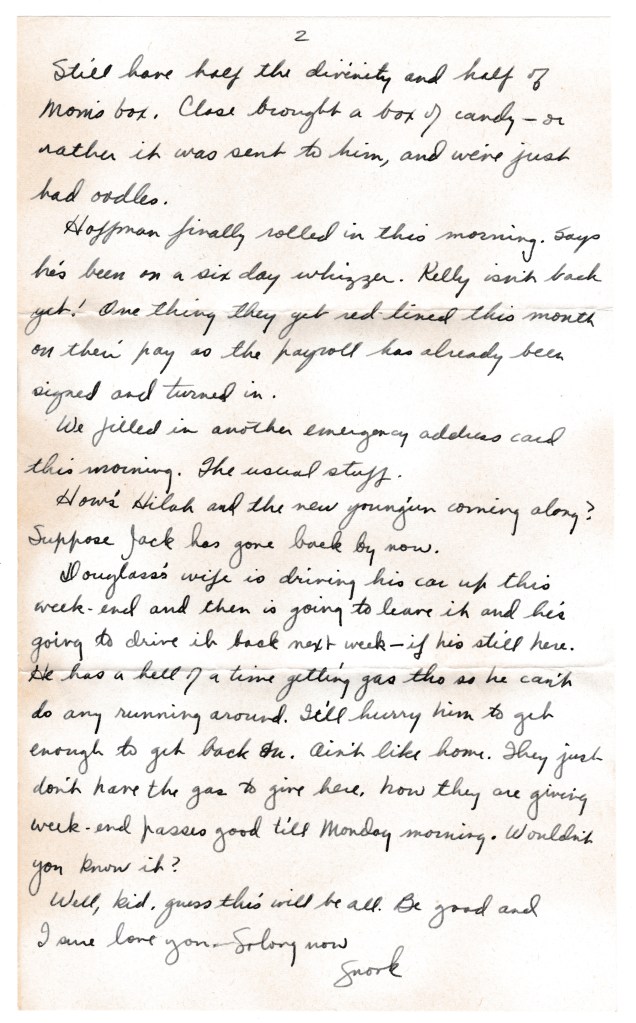 Douglass’s wife is driving his car up this week-end and then is going to leave it and he’s going to drive it back next week – if he’s still here. He has a hell of a time getting gas tho so he can’t do any running around. [unknown] hurry him to get enough to get back on. Ain’t like home. They just don’t have the gas to give here. Now they are giving week-end passes good till Monday morning. Wouldn’t you know it?