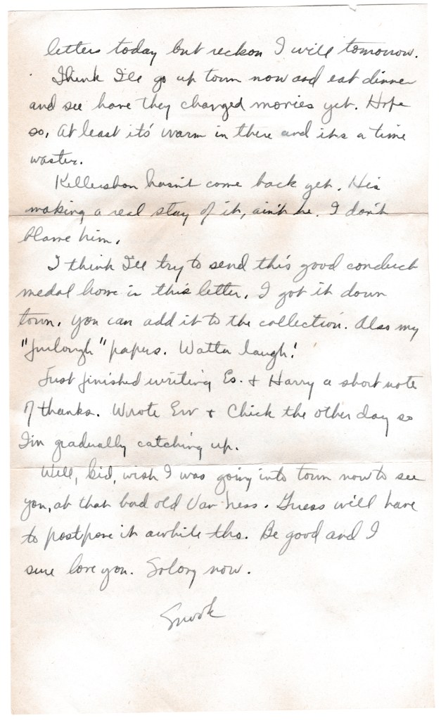 I think I’ll try to send this good conduct medal home in this letter. I got it down town. You can add it to the collection. Also my “furlough” papers. Watta laugh!
