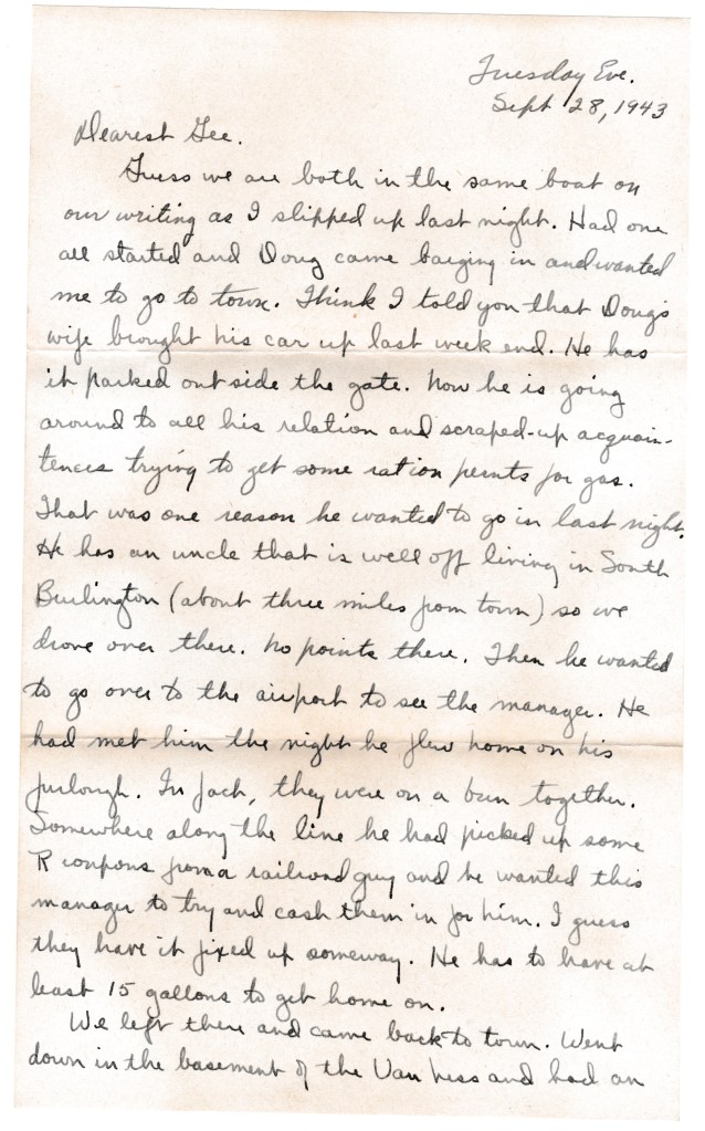 Guess we are both in the same boat on our writing as I slipped up last night. Had one all started and Doug came barging in and wanted me to go to town. Think I told you that Doug’s wife brought his car up last week end. He has it parked outside the gate. Now he is going around to all his relation and scraped-up acquaintances trying to get some ration points for gas. That was one reason he wanted to go in last night. He has an uncle that is well off living in South Burlington (about three miles from town) so we drove over there. No points there. Then he wanted to go over to the airport to see the manager. He had met him the night he flew him on his furlough. In fact, they were on a bun together. Somewhere along the lines he had picked up some R coupons from a railroad guy and he wanted this manager to try and cash them in for him. I guess they have it fixed up someway. He has to have at least 15 gallons to get home on.