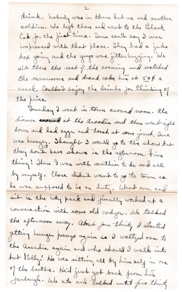 We left there and came back to town. Went down in the basement of the Van Ness and had an drink. Nobody was in there but us and another soldier. We left there and went to the Black Cat for the first time. Sure can’t say I was impressed with that place. They had a juke box going and the guys were jitter bugging. We sit there the rest of the evening and watched the maneuvers and drank Coke hi’s at 50¢ a crack. Couldn’t enjoy the drinks for thinking of the price.
