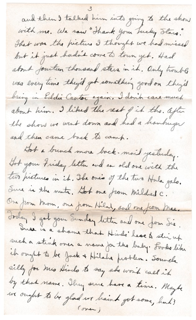 Sunday I went in town around noon. Ate dinner at the Arcadia and then went right down and had eggs and toast at some joint. Sure was hungry. Thought I would go to the show but they don’t have any shows in the afternoon. Fine thing! There I was with nuthin to do and all by myself. Close didn’t want to go to town as he was supposed to be on duty. Went over and sit in the city park and finally worked up a conversation with some old codger. We talked the afternoon away. About four thirty I started getting hunger pangs again so I waltzed over to the Arcadia again and who should I walk into but Kelly! He was sitting all by himself in one of the booths. He’d just got back from his furlough. We ate and talked until five thirty and then I talked him into going to the show with me. We saw “Thank Your Lucky Stars.” That was the picture I thought we had missed but it just hadn’t come to town yet. Had about fourteen thousand stars in it. Only trouble was every time they’d get something good on they’d bring in Eddie Cantor again. I don’t care much about him. I liked the rest of it tho. After the show we went down and had a hamburger and then came back to camp.