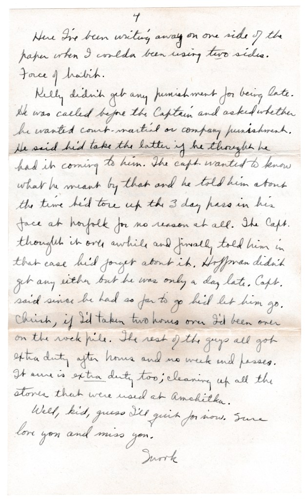 Kelly didn’t get any punishment for being late. He was called before the Captain and asked whether he wanted court-martial or company punishment. He said he’d take the latter if he thought he had it coming to him. The Capt. wanted to know what he meant by that and he told him about the time he’d tore up the 3 day pass in his face at Norfolk for no reason at all. The Capt. thought it over awhile and finally told him in that case he’d forget about it. Hoffman didn’t get any either but he was only a day late. Capt. said since he had so far to go he’d let him go. Christ, if I’d taken two hours over I’d been over on the rock pile. The rest of the guys all got extra duty after hours and no weekend passes. It sure is extra duty too; cleaning up all the stoves that were used at Amchitka.