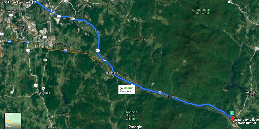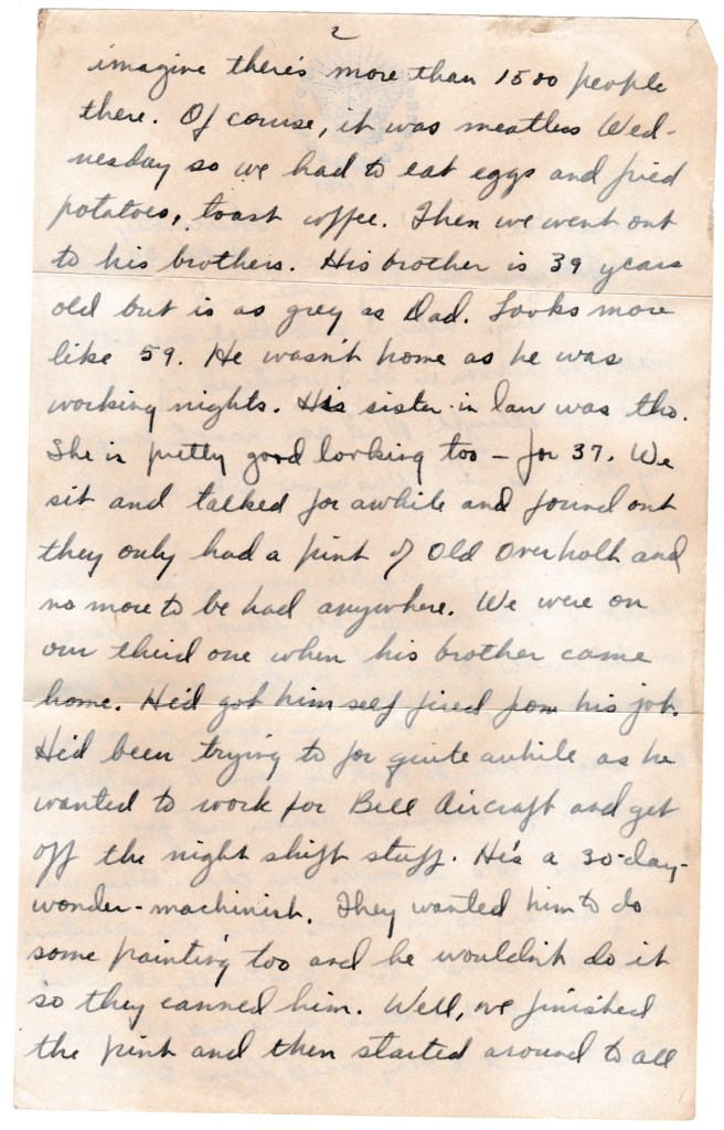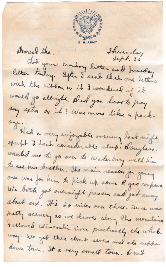 Had a very enjoyable evening last night except I lost considerable sleep. Douglass wanted me to go over to Waterbury with him to see his brother. The main reason for going over was for him to pick up some R gas coupons. We both got overnight passes and got away about six. It’s 26 miles over there. Sure was pretty scenery as we drove along the mountains. Followed Winooski river practically the whole way. We got there about seven and ate supper downtown. It’s a very small town. Don’t imagine there’s more than 1500 people there. Of course, it was meatless Wednesday so we had to eat eggs and fried potatoes, toast, coffee. Then we went out to his brother’s. His brother is 39 years old but is as grey as Dad. Looks more like 59. He wasn’t home as he was working nights. His sister-in-law was tho. She is pretty good looking too — for 37. We sit and talked for awhile and found out they only had a pint of Old Overholt and no more to be had anywhere. We were on our third one when his brother came home. He’d got himself fired from his job. He’d been trying to for quite awhile as he wanted to work for Bell Aircraft and get off the night shift stuff. He’s a 30-day wonder-machinist. They wanted him to do some painting too and he wouldn’t do it so they canned him. Well, we finished the pint and then started around to all the neighbors. They didn’t have any either but we had a nice visit. Mills I think their name was. Then we went to another neighbor across the street and he just had = that much in the bottom of a quart. We confiscated that and went back to their house and squeezed one more drink out of it. All this sounds like we were stiff but we weren’t. Guess that’s the way they do business. If one doesn’t happen to have any they make the rounds. They didn’t know Doug was coming or they’d have had some.
