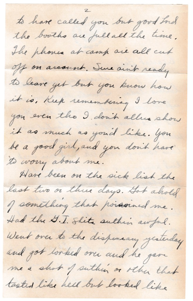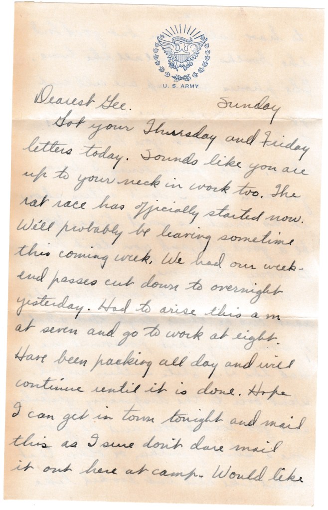 Got your Thursday and Friday letters today. Sounds like you are up to your neck in work too. The rat race has officially started now. Will probably be leaving sometime this coming week. We had our week-end passes cut down to overnight yesterday. Had to arise this a.m. at seven and go to work at eight. Have been packing all day and will continue until it is done. Hope I can get in town tonight and mail this as I sure don’t dare mail it out here at camp. Would like to have called you but good Lord the booths are full all the time. The phones at camp are all cut off on account. Sure ain’t ready to leave yet but you know how it is. Keep remembering I love you even tho I don’t always show it as much as you’d like. You be a good girl, and you don’t have to worry about me.