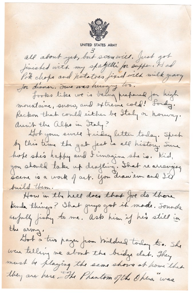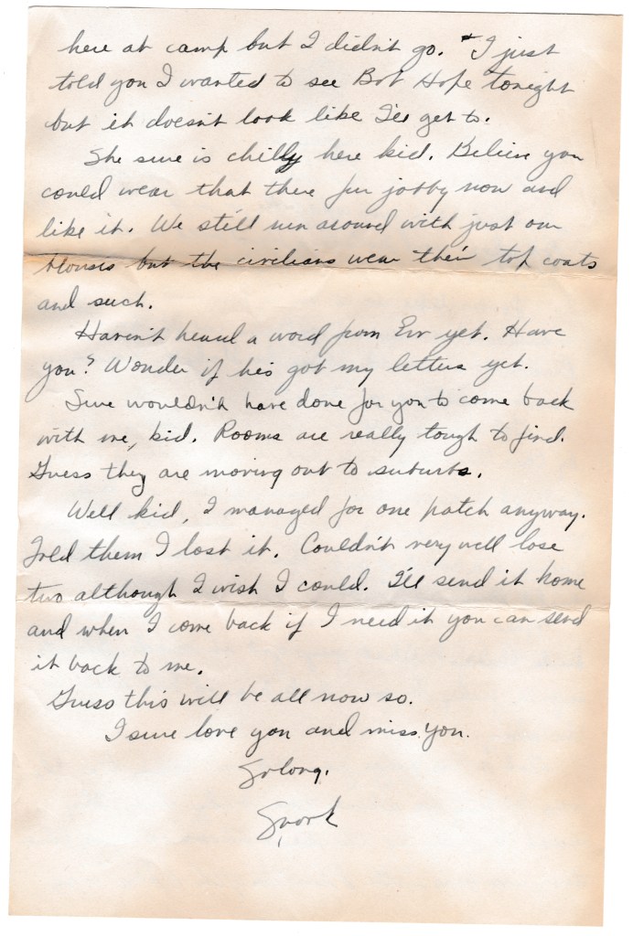 Got a two page from Mildred today too. She was telling me about the bridge club. They must be playing the same shows at home that they are here. “The Phantom of the Opera” was here at camp but I didn’t go. I just told you I wanted to see Bob Hope tonight but it doesn’t look like I’ll get to.