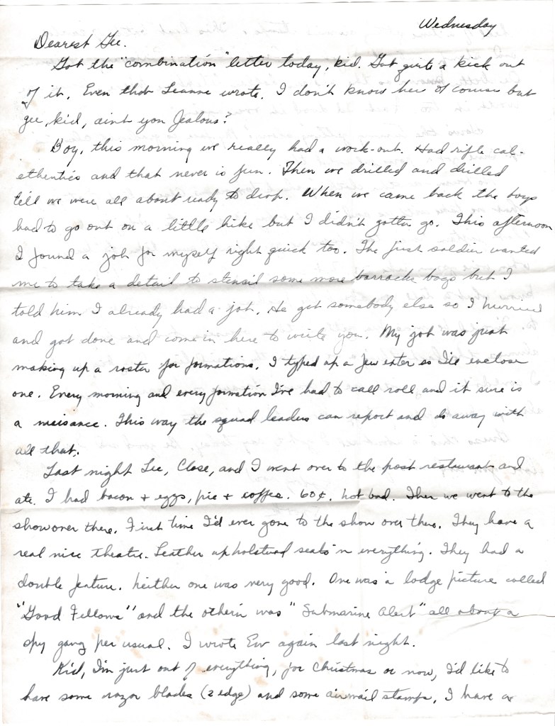 Kid, I’m just out of everything, for Christmas or now, I’d like to have some razor blades (2 edge) and some airmail stamps. I have a hell of a time getting airmail stamps. This last batch of envelopes and stamps combined I got at Camp Stoneman, Pittsburg, California. Or better known as the sixteen dollar telephone place. Sure was worth it too. Fact I’d do it over again.
