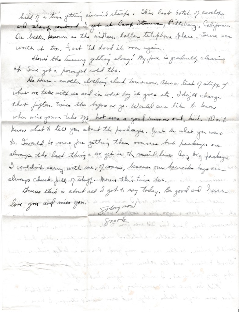Ho Hum — another clothing check tomorrow. Also a list of stuff of what we take with us and in what bag it goes, etc. Would sure like to know when we’re gonna take off. Not even a good rumor out, kid. Don’t know what to tell you about the package. Just do what you want to. It would be more fun getting them overseas but packages are always the last things we get in the mail line. Any big packages I couldn’t carry with me, of course, because our barracks bags are always chock full of stuff. More so this time too.