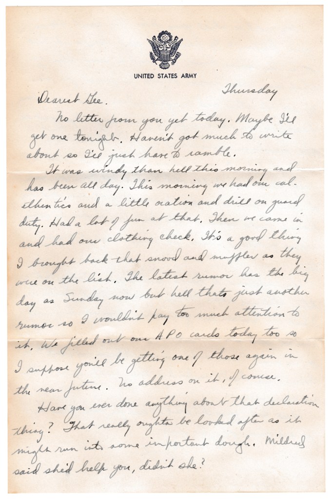 It was windy than hell this morning and has been all day. This morning we had one calisthenics and a little oration and drill on guard duty. Had a lot of fun at that. It’s a good thing I brought back that snood and muffler as they were on the list. The latest rumor has the big day as Sunday now but hell that’s just another rumor so I wouldn’t pay too much attention. We filled out our APO cards today too so I suppose you’ll be getting one of those again in the near future. No address on it, of course.