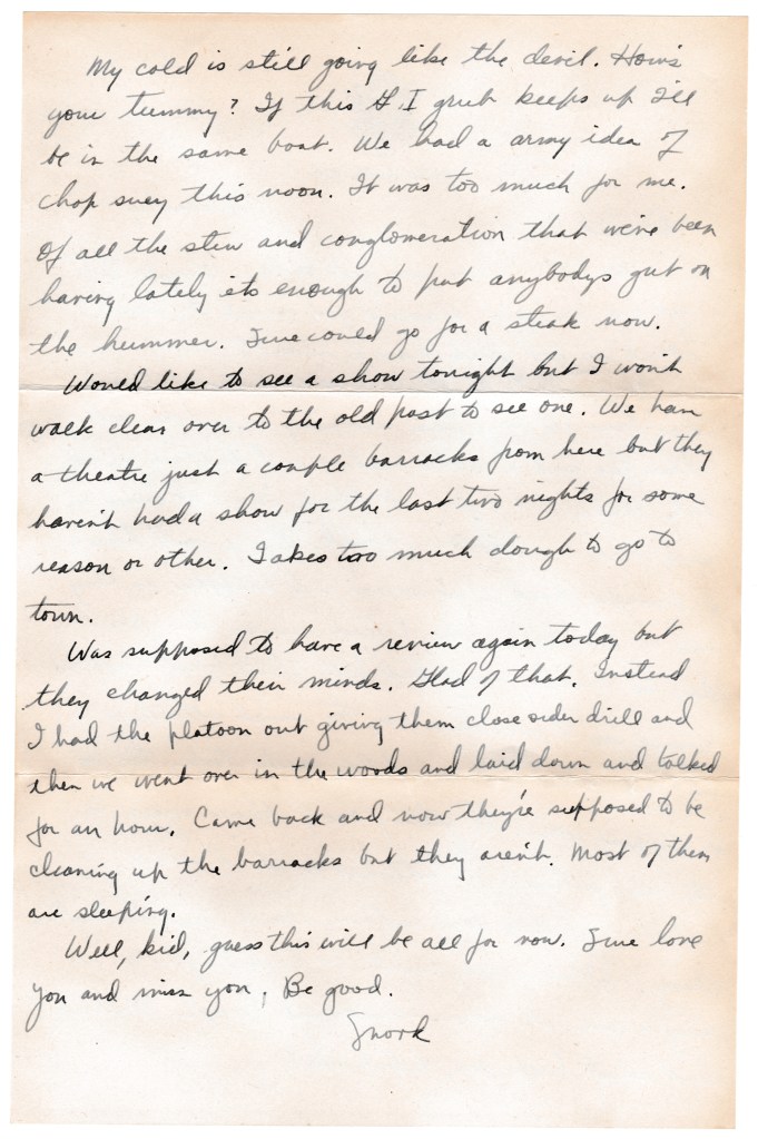 My cold is still going like the devil. How’s your tummy. If this GI grub keeps up I’ll be in the same boat. We had a army idea of chop suey this noon. It was too much for me. Of all the stew and conglomeration that we’ve been having lately it’s enough to put anybody’s gut on the hummer. Sure could go for a steak now.