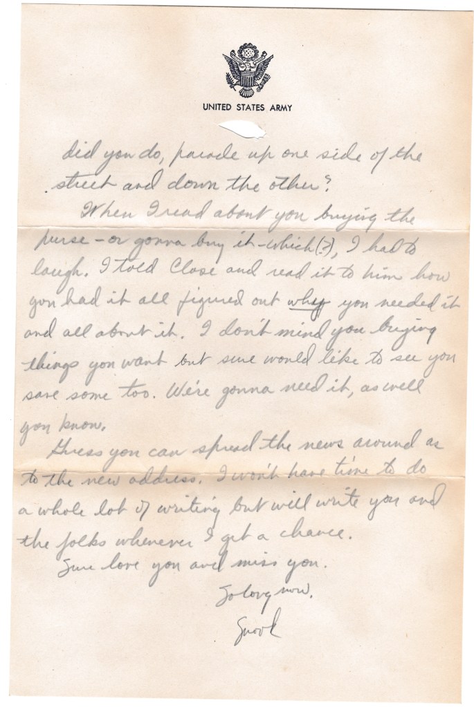 When I read about you buying the purse — or gonna buy it — which (?), I had to laugh. I told Close and read it to him how you had it all figured out why you needed it and all about it. I don’t mind you buying things you want but sure would like to see you save some too. We’re gonna need it, as well you know.
