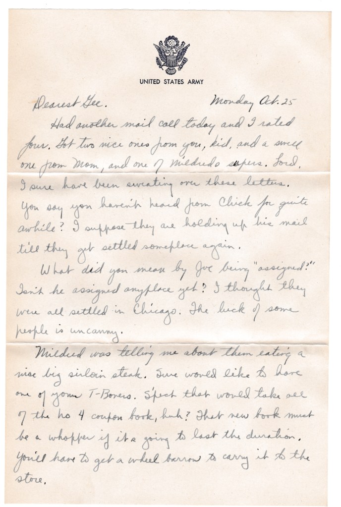 Had another mail call today and I rated four. Got two nice ones from you, kid, and a swell one from Mom, and one of Mildred’s supers. Lord. I sure have been sweating over these letters. You say you haven’t heard from Chick for quite awhile? I suppose they are holding up his mail till they get settled someplace again.