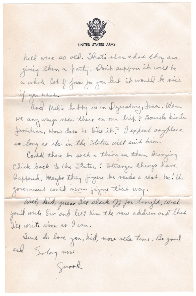 So you didn’t like that one letter, huh? Well, you just don’t worry. You know by now that we just have to go through all these things. I hope this will be our last trip across and that the next time we come back it’ll be to come back for good. That can’t be any too soon to suit any of us. Sure think of you all the time, kid.