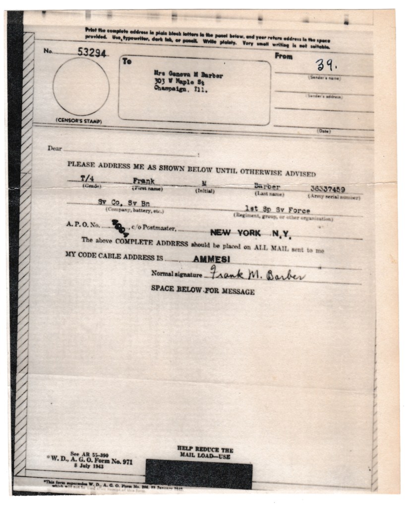 This V-Mail is just an APO address change since the Force was moving on to Italy from Oran, Algiers in North Africa in just a few days.