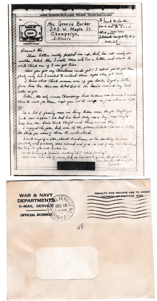 Champaign-Urbana are twin cities in central Illinois, so the annual grudge match between their two original high school football teams was a long standing tradition for decades. Snook attended and graduated from Urbana High School, so his loyalties in this letter are no surprise. Unfortunately, Snook wouldn’t be home to see the two teams play each other again until 1946, when his Urbana Tigers were again shut out, 27-0, by the Champaign Maroons. While he was away at war, Champaign would shut out Urbana, 13-0, in a rescheduled game on November 16, 1944, and once more 25-0 on November 2, 1945. The shutouts finally ended in 1947, when Urbana still lost but managed to put 6 points on the board for dignity.
