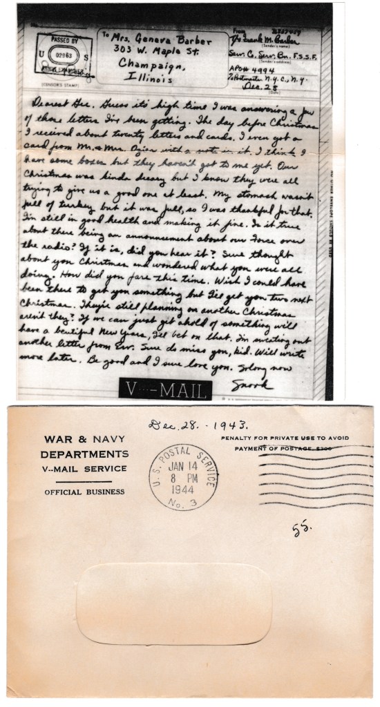Guess it’s high time I was answering a few of those letters I’ve been getting. The day before Christmas I received about twenty letters and cards. I even got a card from Mr. & Mrs. Ozier with a note in it. I think I have some boxes but they haven’t got to me yet. Our Christmas was kinda dreary but I know they were all trying to give us a good one at least. My stomach wasn’t full of turkey, but it was full, so I was thankful for that. I’m still in good health and making it fine. Is it true about there being an announcement about our Force over the radio? If it is, did you hear it? Sure thought about you Christmas and wondered what you were all doing. How did you fare this time. Wish I could have been there to get you something but I’ll get you two next Christmas. They’re still planning on another Christmas, aren’t they? If we can just get ahold of something we’ll have a beautiful New Years, I’ll bet on that. I’m sweating out another letter from Erv. Sure do miss you, kid. Will write more later. Be good and I sure love you.