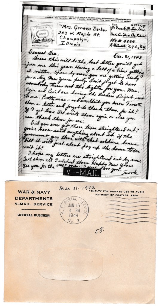 Guess this will be the last letter you’ll get from me this year. Having a hell of a time getting it written. S’pose by now you are getting ready for a big New Years part. Don’t forget to have somebody turn out the lights for you. Mrs. Ozier and Cecil are having the Reader’s Digest sent to me. Pretty nice – and wouldn’t you know I wrote them a letter and forgot to thank them for it? If I get the time I’ll write them again or else you can thank them for me.