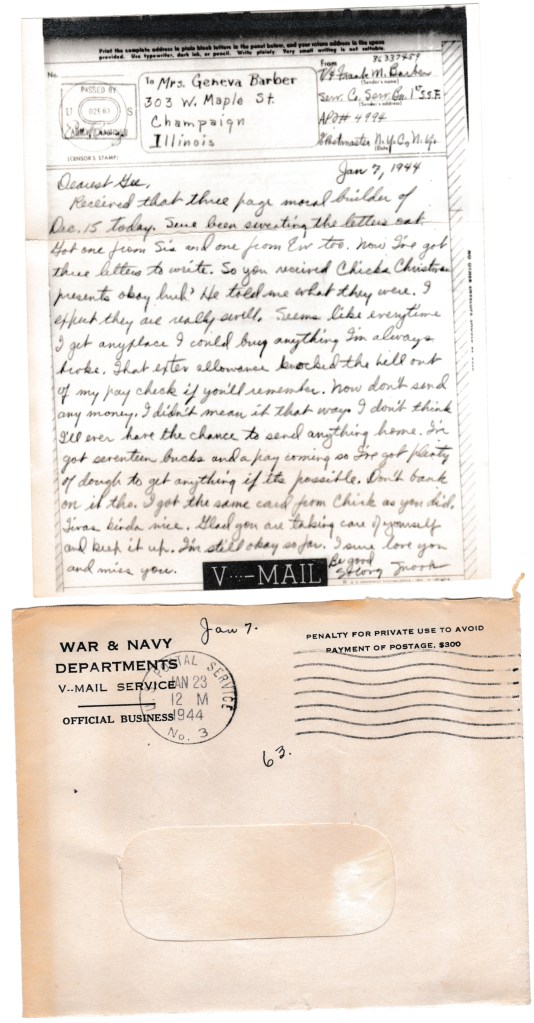 Received that three page morale builder of Dec. 15 today. Sure been sweating the letters out. Got one from Sis and one from Erv too. Now I’ve got three letters to write. So you received Chick’s Christmas presents okay, huh? He told me what they were. I expect they are really swell. Seems like everytime I get anyplace I could buy anything I’m always broke. That extra allowance knocked the hell out of my pay check if you remember. Now don’t send any money. I didn’t mean it that way. I don’t think I’ll ever have the chance to send anything home. I’ve got seventeen bucks and a pay coming so I’ve got plenty of dough to get anything if it’s possible. Don’t bank on it tho. I got the same card from Chick as you did. Twas kinda nice. Glad you are taking care of yourself and keep it up. I’m still okay so far. I sure love you and miss you. Be good.