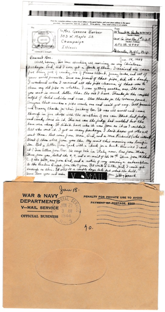 Well, honey. I’ve been spending all morning on my Christmas packages. Lord, did I ever get a flock of them. I received six cans, five being full of candy, one of Prince Albert, funny books, and all of your swell presents. Sure am proud of that pipe, kid, it’s a dandy. I wondered when I received all the pipe cleaners if that was to clean my old pipe or whether I was getting another one. The one you sent is much better than the one I have. Thanks for the complete outfit of toilet articles and case. Also thanks for the tobacco pouch. Everyone that smokes a pipe wants one and can’t get any. Tell Joannie and Francy thanks for their packages too. It was all swell and came through in fine shape with the exception of one can that had fudge and candy bars in it. This one can the fudge had molded but the bars were okay. It didn’t have who it was from on it so I couldn’t tell who sent it. I got so many packages I don’t know yet who all sent them. Got some from Mom, Dad, and a Mrs. Picknell (who is that?). Most of them are from you tho. My mail this morning was terrific too. Got a letter from Jack with a check for a buck. How will I cash it? Two letters from Erv. He says he’s in Italy now. One from Mae, three from you, dated the 4, 7, and a v-mail from the 30th. Three from Mildred C. of the 30th, one from Dad, and a notice of my receiving a subscription to the Reader’s Digest from the Oziers. I’ll write a letter, kid, I can’t get enough on this. It will be a couple days late but what the hell. Sure love you and miss you.