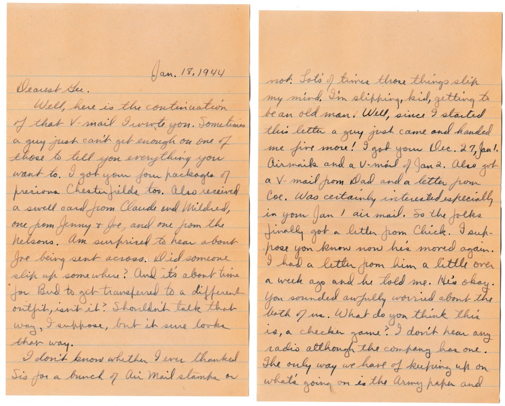 Well, here is the continuation of that v-mail I wrote you. Sometimes a guy just can’t get enough on one of those to tell you everything you want to. I got your four packages of precious Chesterfields too. Also received a swell card from Claude and Mildred, one from Jenny + Joe [Chick], and one from the Nelsons. Am surprised to hear about Joe being sent across. Did someone slip up somewhere? And it’s about time for Bud to get transferred to a different outfit, isn’t it? Shouldn’t talk that way, I suppose, but it sure looks that way.