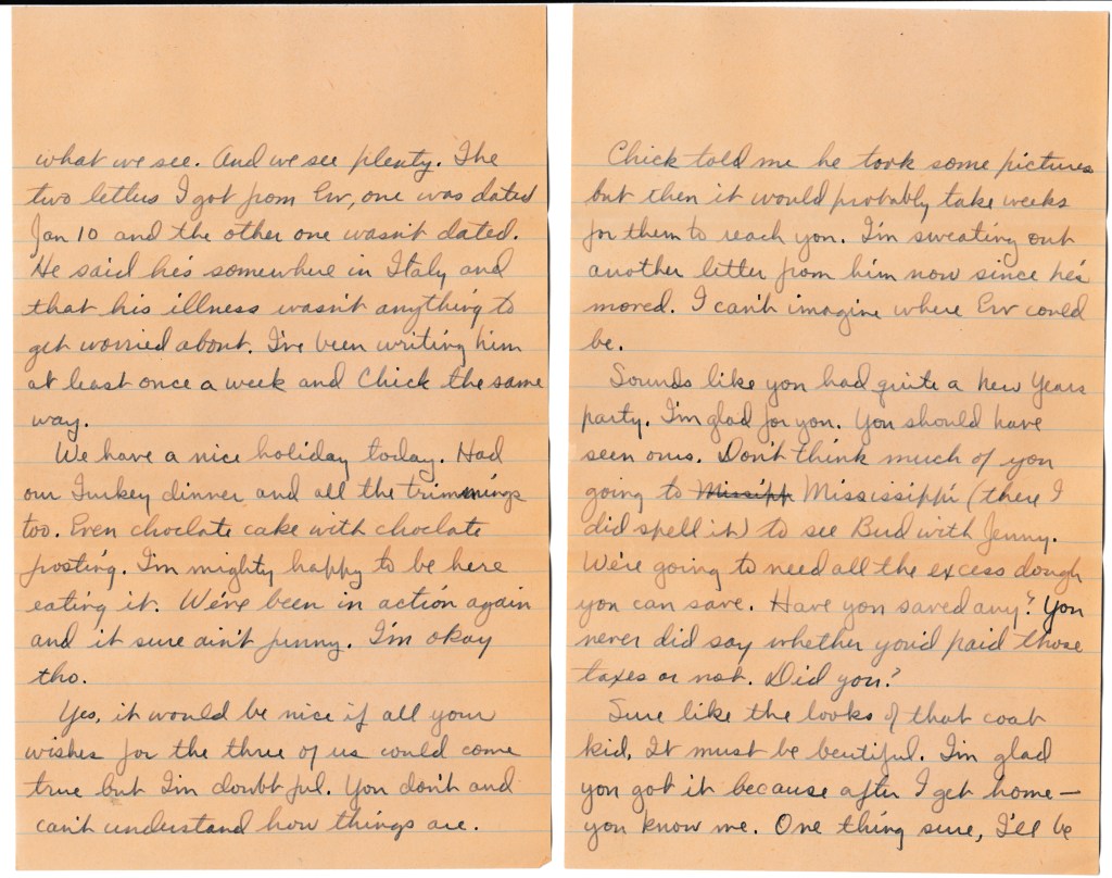 I don’t know whether I ever thanked Sis for a bunch of Air Mail stamps of not. Lot’s of times those things slip my mind. I’m slipping, kid, getting to be an old man. Well, since I started this letter a guy just came and handed me five more! I got your Dec. 27, Jan. 1 airmails and a v-mail of Jan 2. Also got a v-mail from Dada and a letter from Coe. Was certainly interested especially in your Jan. 1 airmail. So the folks finally got a letter from Chick. I supposed you know now he’s moved again. I had a letter from him a little over a week ago and he told me. He’s okay. You sounded awfully worried about the both of us. What do you think this is, a checker game? I don’t hear any radio although the company has one. The only way we have of keeping up on what’s going on is the Army paper and what we see. And we see plenty. The two letters I got from Erv, one was dated Jan. 10 and the other one wasn’t dated. He said he’s somewhere in Italy and that his illness wasn’t anything to get worried about. I’ve been writing him at least once a week and Chick the same way.