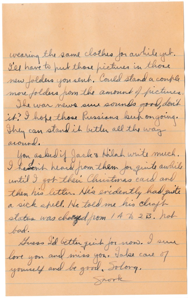 Guess I’d better quit for now. I sure love you and miss you. Take care of yourself and be good. So long.