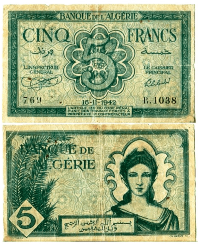 P.S. I’m enclosing an Algerian Franc note. It’s worth a dime too. Add it to the collection. Snook