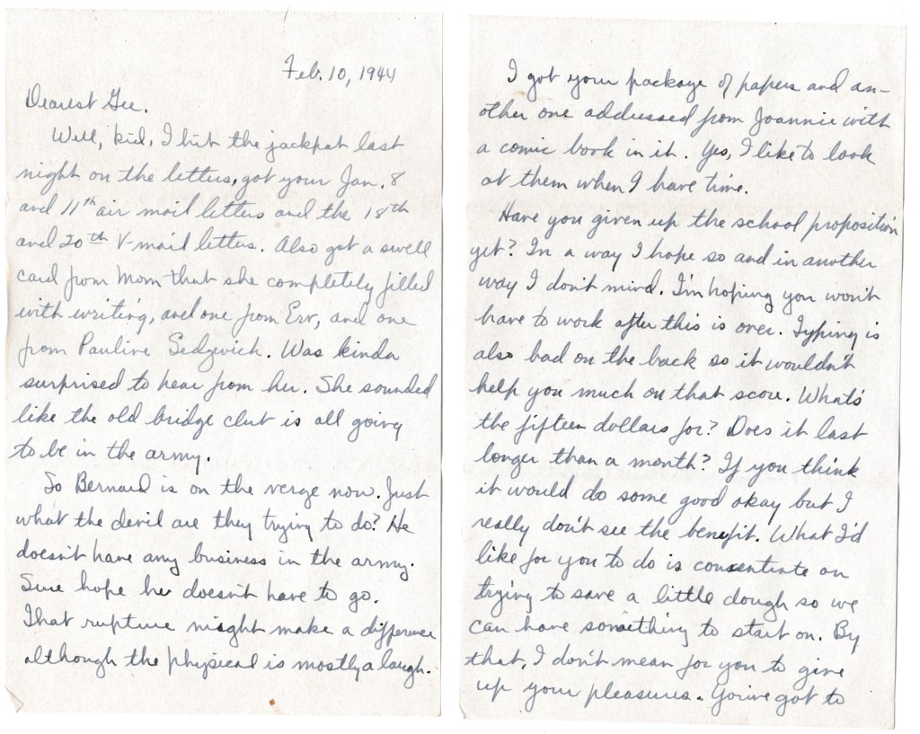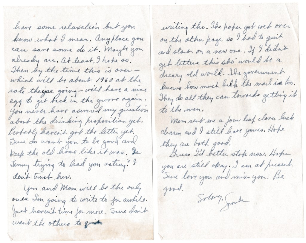 Have you given up the school proposition yet? In a way I hope so and in another way I don’t mind. I’m hoping you won’t have to work after this is over. Typing is also bad on the back so it wouldn’t help you much on that score. What’s the fifteen dollars for? Does it last longer than a month? If you think it would do some good okay but I really don’t see the benefit. What I’d like for you to do is concentrate on trying to save a little dough so we can have something to start on. By that, I don’t mean for you to give up your pleasures. You’ve got to have some relaxation but you know what I mean. Anyplace you can save some do it. Maybe you already are. At least, I hope so. Then by the time this is over —which will be about 1960 at the rate they’re going — we’ll have a nice egg to get back in the groove again. You never have answered my question about the drinking proposition yet. Probably haven’t got the letter yet. Sure do want you to be good and keep the old home like it was. Is Jenny trying to lead you astray? I don’t trust her.