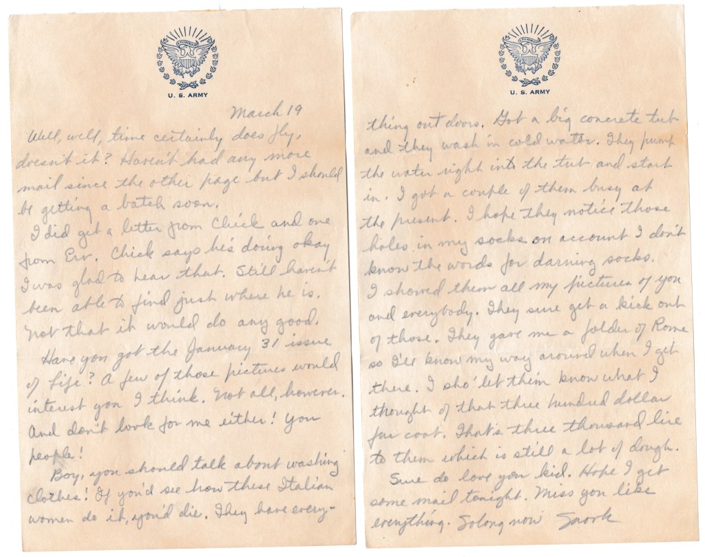 Boy, you should talk about washing clothes! If you’d see how these Italian women do it, you’d die. They have everything outdoors. Got a big concrete tub and they wash in cold water. They pump the water right into the tub and start in. I got a couple of them busy at the present. I hope they notice those holes in my socks on account I don’t know the words for darning socks. I showed them all my pictures of you and everybody. They sure get a kick out of those. They gave me a folder of Rome so I’ll know my way around when I get there. I sho’ let them know what I thought of that three hundred dollar fur coat. That’s three thousand lire to them which is still a lot of dough.