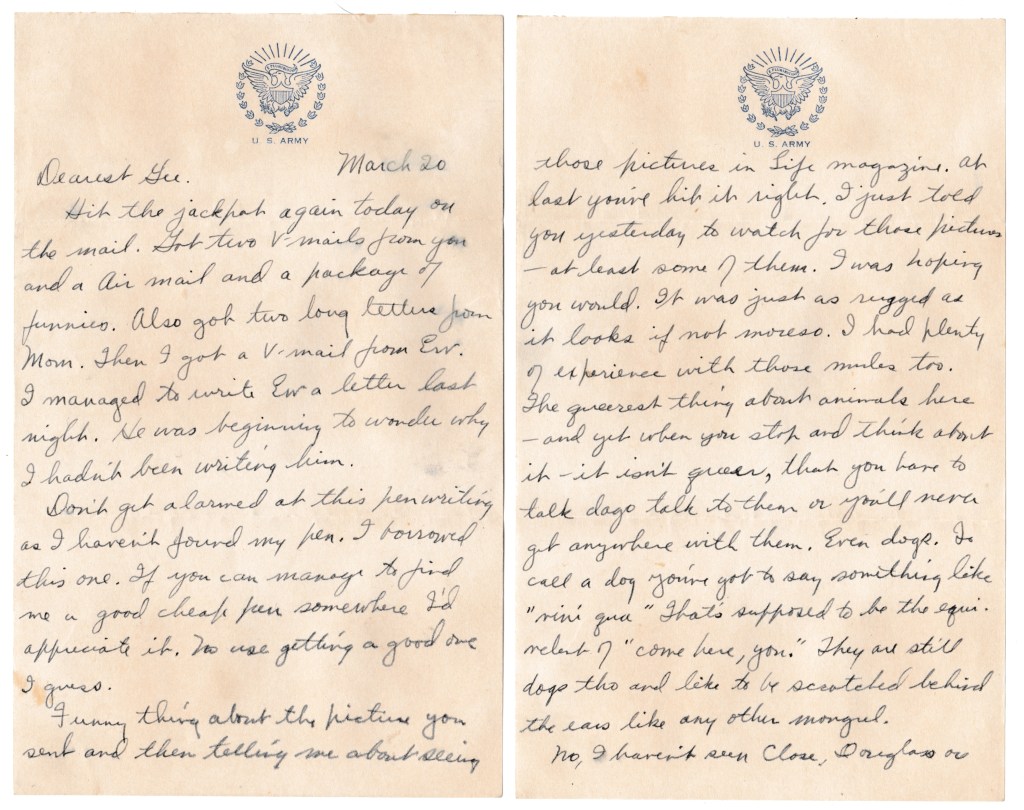 Funny thing about the pictures you sent and then telling me about seeing those pictures in Life magazine. At last you’ve hit it right. I just told you yesterday to watch for those pictures — at least some of them. I was hoping you would. It was just as rugged as it looks if not mores. I had plenty of experience with those mules too. The queerest thing about animals here — and yet when you stop and think about it — it isn’t queer, that you have to talk ago talk to them or you’ll never get anywhere with them. Even dogs. To call a dog you’ve got to say something like “vini qua”. That’s supposed to be the equivalent of “come here, you.” They are still dogs tho and like to be scratched behind the ears like any other mongrel.