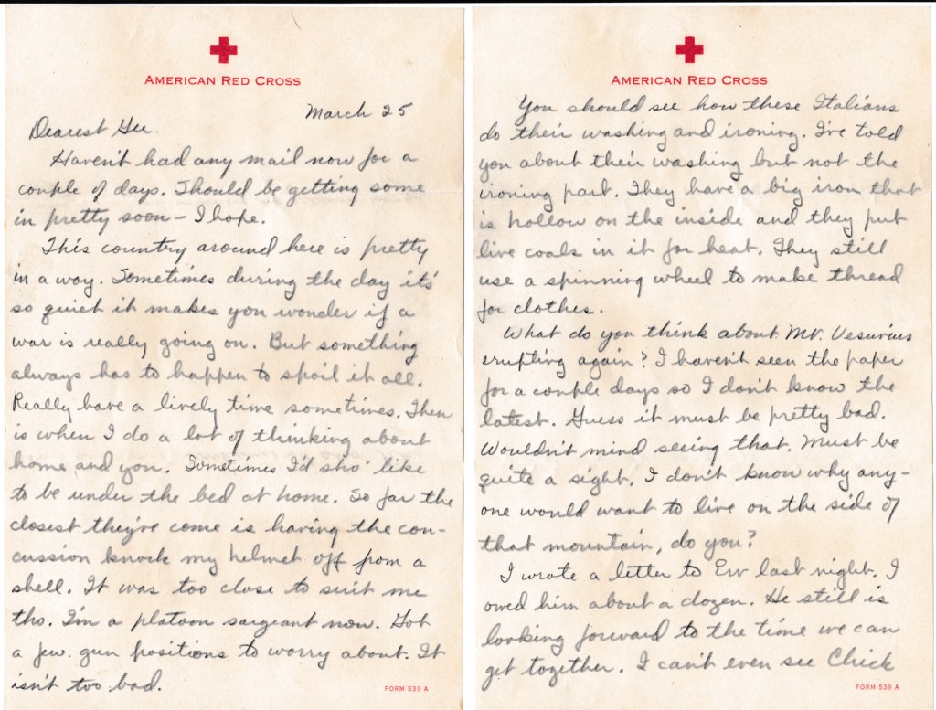This country around here is pretty in a way. Sometimes during the day it’s so quiet it makes you wonder if a war is really going on. But something always has to happen to spoil it all. Really have a lively time sometimes. Then is when I do a lot of thinking about home and you. Sometimes I’d sho’ like to be under the bed at home. So far the closest they’ve come is having the concussion knock my helmet off from a shell. It was too close to suit me tho. I’m a platoon sergeant now. Got a few gun positions to worry about. It isn’t too bad.