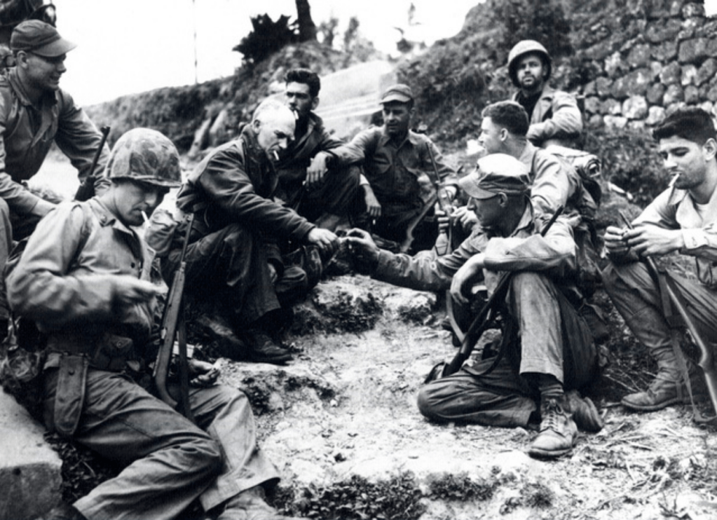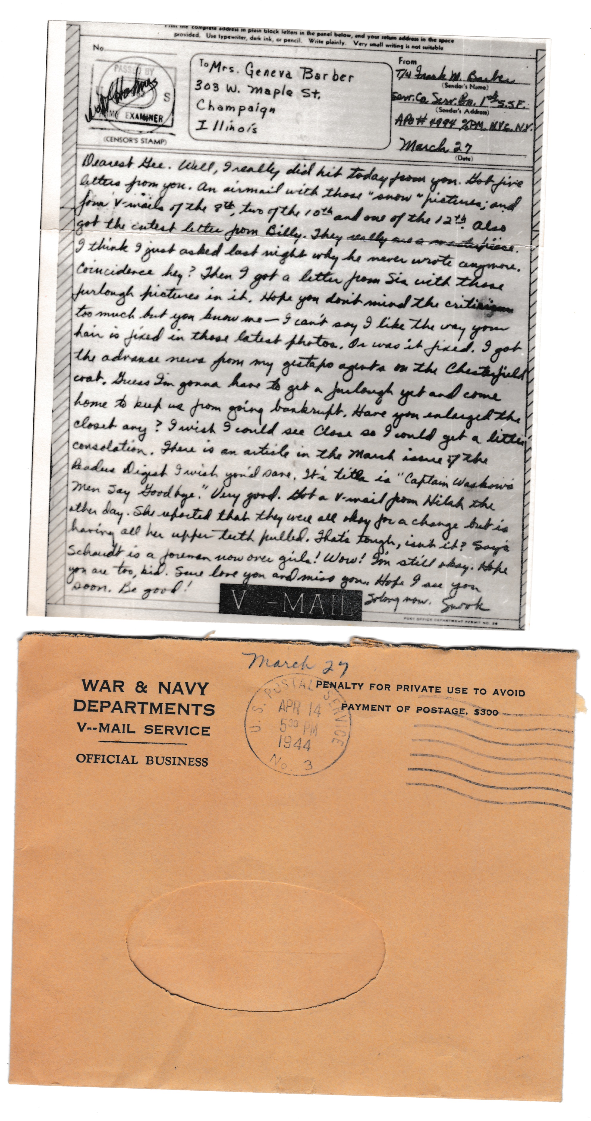 Well, I really did hit today from you. Got five letters from you. An airmail with those “snow” pictures, and four v-mails of the 8th, two of the 10th and one of the 12th. Also got the cutest letter from Billy. They really are a masterpiece. I think I just asked last night why he never wrote anymore. Coincidence hey? Then I got a letter from Sis with those furlough pictures in it. Hope you don’t mind the criticism too much but you know me — I can’t say I like the way your hair is fixed in those latest photos. Or was it fixed. I got the advance news from my gestapo agents on the Chesterfield coat. Guess I’m gonna have to get a furlough yet and come home to keep us from going bankrupt. Have you enlarged the closet any? I wish I could see Close so I could get a little consolation. There is an article in the March issue of the Reader’s Digest I wish you’d save. It’s title is “Captain Waskow’s Men Say Good-bye.” Very good. Got a v-mail from Hilah the other day. She reported that they were all okay for a change but is having all her upper teeth pulled. That’s tough, isn’t it? Says Schaudt is a foreman now over girls! Wow! I’m still okay. Hope you are too, kid. Sure love you and miss you. Hope I see you soon. Be good!