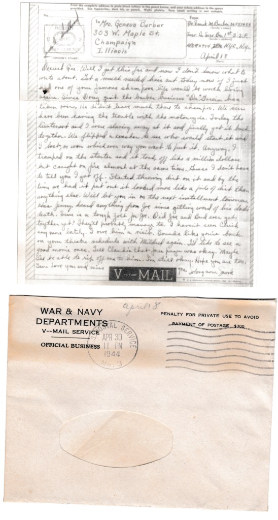 Well, I got this far and now I don’t know what to write about. Got a much needed hair cut today now if I just had one of your famous shampoos life would be worth living again. Since Doug quit the barber business “Dr Garcia” has taken over. He didn’t leave much there to shampoo. We sure have been having the trouble with the motorcycle. Today the lieutenant and I were slaving away at it and finally got it back together. We flipped a washer to see who would start it and I lost, or won, whichever way you want to put it. Anyway, I tromped on the starter and it took off like a million dollars but caught on fire almost at the same time. Guess I don’t have to tell you I got off. Started throwing dirt on it and by the time we had it put out it looked more like a pile of dirt than anything else. Will let you in on the next installment tomorrow. Has Jenny heard anything from Joe since getting word of his dad’s death. Sure is a tough jolt for Joe. Did Joe and Bud ever get together yet? They’ll probably manage to. I haven’t seen Chick anymore lately. I owe him a visit. Sounds like you’re back on your theatre schedule with Mildred again. I’d like to see a good movie once. Tell Claudie that four pager was okay. Maybe I’ll be able to rip one off to him. I’m still okay. Hope you are too. Sure love you and miss you.