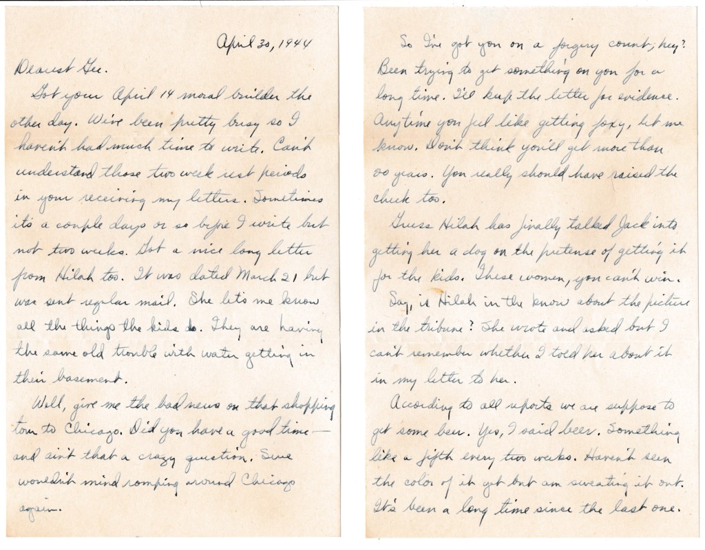 Got your April 14 morale builder the other day. We’ve been pretty busy so I haven’t had much time to write. Can’t understand those two week rest periods in your receiving letters. Sometimes it’s a couple days or so before I write but not two weeks. Got a nice long letter from Hilah too. It was dated March 21 but was sent regular mail. She let’s me know all the things the kids do. They are having some old trouble with water getting in their basement.