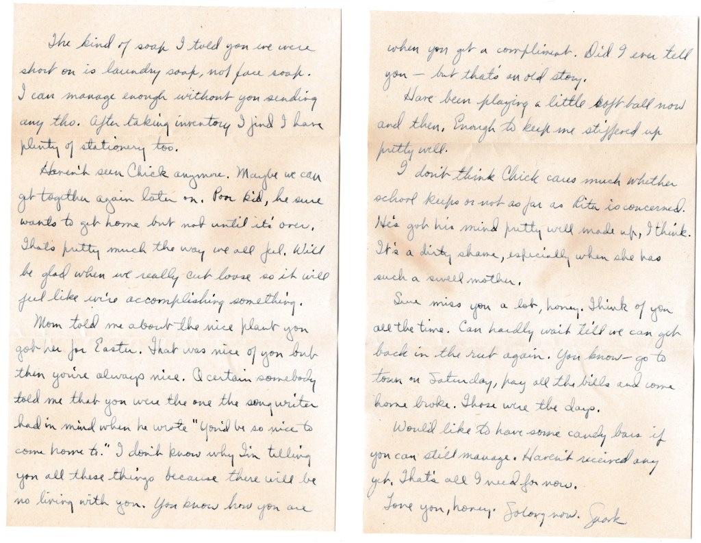 Sure miss you a lot, honey. Think of you all the time. Can hardly wait till we can get back in the rut again. You know — go to town on Saturday, pay all the bills and come home broke. Those were the days.