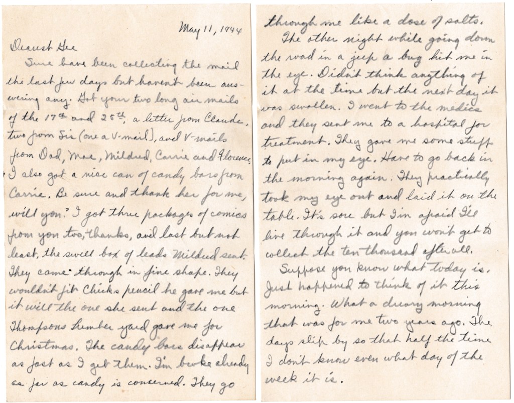 Sure have been collecting the mail the last few days but haven’t been answering any. Got your two long air mails of the 17th and 25th, a letter from Claude, two from Sis (one a v-mail), and v-mails from Dad, Mae, Mildred, Carrie and Florence. I also got a nice can of candy bars from [Aunt] Carrie. Be sure and thank her for me, will you? I got three packages of comics from you too, thanks, and last but not least the swell box of leads Mildred sent. They came through in fine shape. They wouldn’t fit Chick’s pencil he gave me but it will the one she sent and the one Thompson’s Lumberyard gave me for Christmas. The candy bars disappear as fast as I get them. I’m broke already as far as candy is concerned. They go through me like a dose of salts.