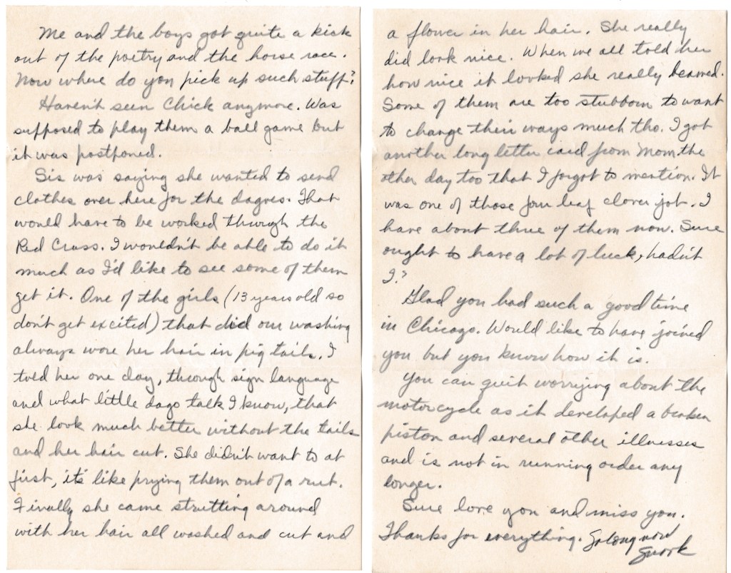 Sis was saying she wanted to send clothes over here for the dagos. That would have to be worked through the Red Cross. I wouldn’t be able to do it much as I’d like to see some of them get it. One of the girls (13 years old so don’t get excited) that did our washing always wore her hair in pig tails. I told her one day through sign language and what little dago talk I know, that she look much better without the tails and her haircut. She didn’t want to at first, it’s like prying them out of a rut. Finally she came strutting around with her hair all washed and cut and a flower in her hair. She really did look nice. When we all told her how nice it looked she really beamed. Some of them are too stubborn to want to change their ways much tho. I got another long letter card from Mom the other day too that I forgot to mention. It was one of those four leaf clover jobs. I have about three of them now. Sure ought to have a lot of luck, hadn’t I?