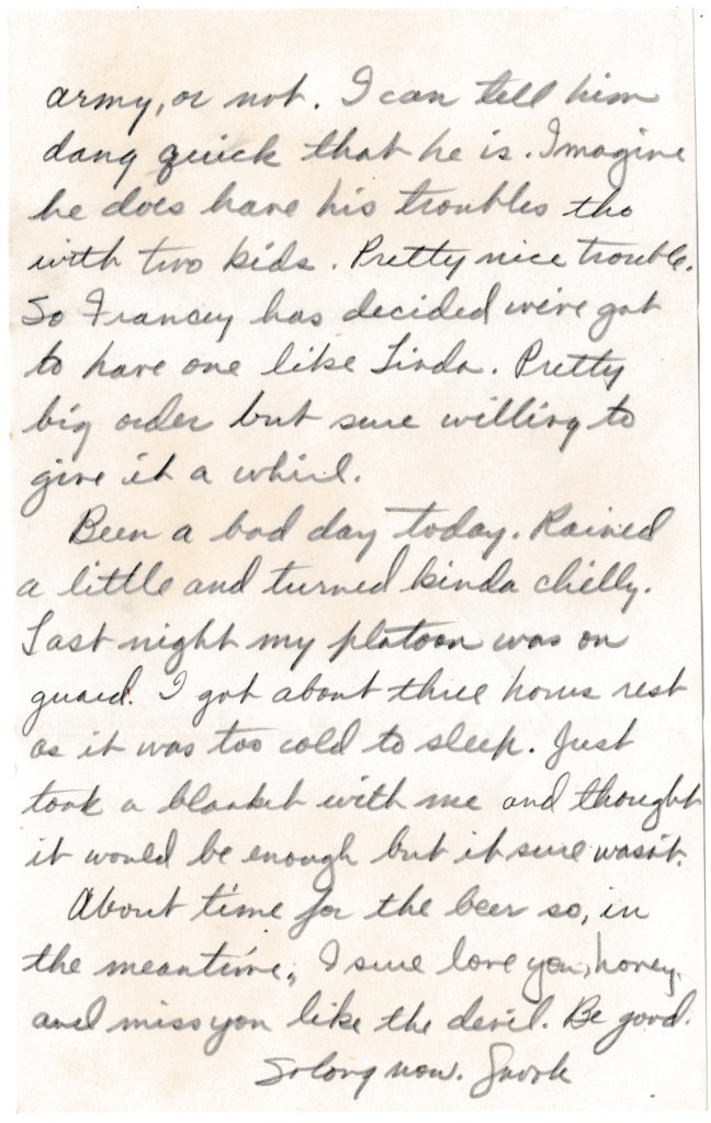 Got a nice letter from Jack and Hilah. He wrote on one side and she wrote a note on the back. He has decided he doesn’t know whether he’s well off out of the army, or not. I can tell him dang quick that he is. Imagine he does have his troubles tho with two kids. Pretty nice trouble. So Francy has decided we’ve got to have one like Linda. Pretty big order but sure willing to give it a whirl.