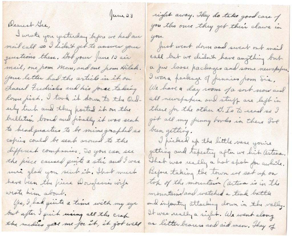 I wrote you yesterday before we had our mail call so I didn’t get to answer your questions then. Got your June 12 airmail, one from Mom, and one from Hilah. Your letter had the article in it on General Frederick’s and his Force taking Rome first. I took it down to the Orderly tent and they posted it on the bulletin board and finally it was sent to headquarters to be mimeographed so copies could be sent around to the different companies. So you can see the piece caused quite a stir and I was sure glad you sent it. That must have been the piece Douglass’s wife wrote him about.