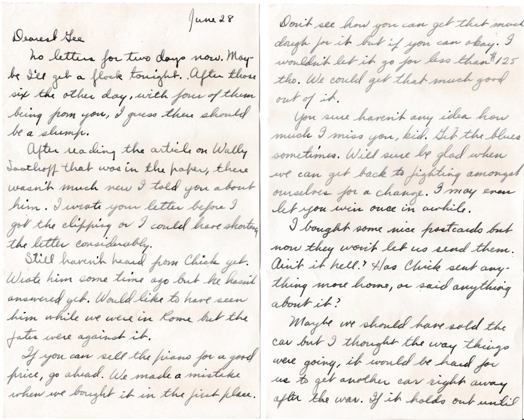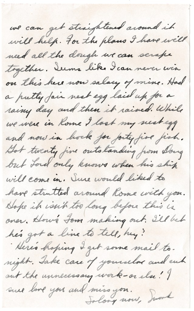 Maybe we should have sold the car but I thought the way things were going, it would be hard for us to get another car right away after the war. If it holds out until we can get straightened around it will help. For the plans I have we’ll need all the dough we can scrape together. Sums like I can never win on this here now salary of mine. Had a pretty fair nest egg laid up for a rainy day and then it rained. While we were in Rome I lost my nest egg and now in hock for forty-five fish. Got twenty-five outstanding from Doug but Lord only knows when his ship will come in. Sure would liked to have strutted around Rome with you. Hope it isn’t too long before this is over. How’s Tom making out. I’ll bet he’s got a line to tell, hey?