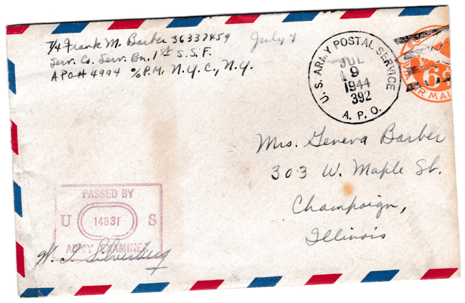 Boy has the mail ever been pouring in! In the last two days I got two delovely packages. One from you and one from Mom. The one from Mom had three rolls of film in it so I can romp again now. The developing end of the deal is the worst. The cookies were devoured last night by me and Nelson, Lee, and a few others. I got the lion’s share. We brewed up a pot of coffee and really made a meal of it. Got a sack of peanuts that was very fine and I’m really stocked up on candy again. Sho thank you kindly, madam. To get back to the mail. Got your June 12 air mail, also yours of 21, 22, 23, 24, 25, 26th. Got two from Mom, and one from Sis, and one from Erv. Been doing a powerful lot of reading. Sis sent me a gob of stamps and now Mom sent me three more. They were slightly stuck to the paper but they finally came loose. (This sure is poor ink – think I’ll change.). This is better.