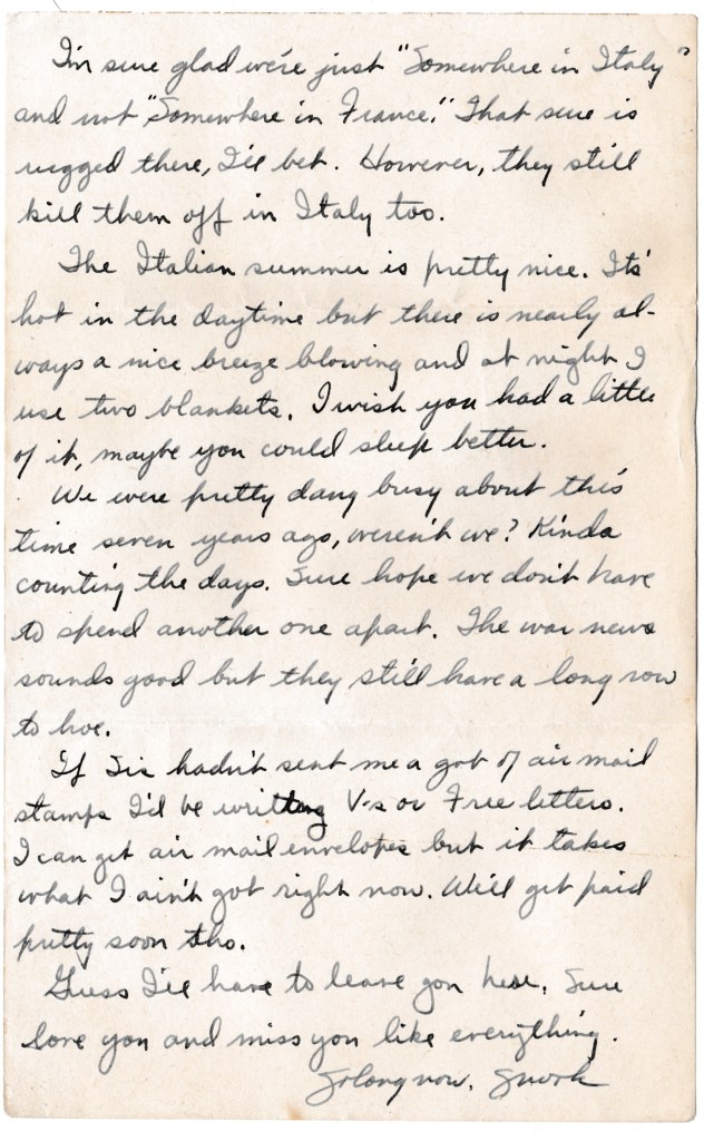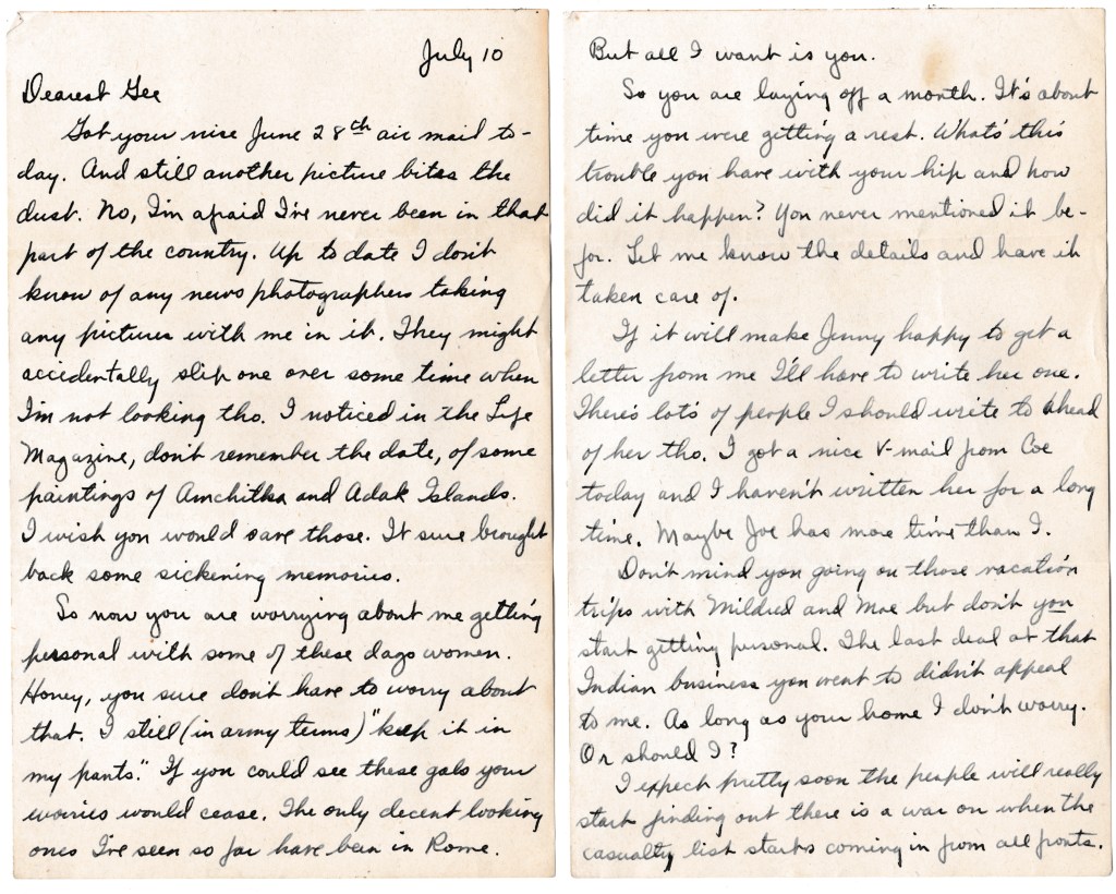 So now you are worrying about me getting personal with some of these dago women. Honey, you sure don’t have to worry about that. I still (in army terms) “keep it in my pants.” If you could see these gals your worries would ease. The only decent looking ones I’ve seen so far have been in Rome. But all I want is you.