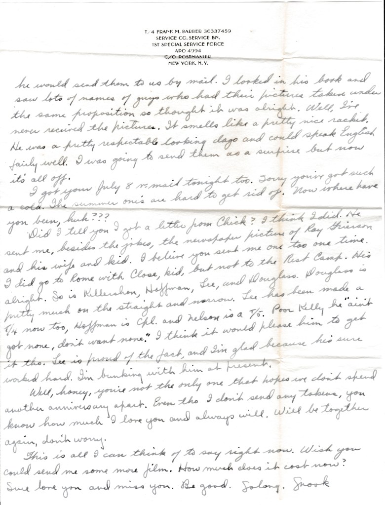 Say, this is certainly some very fancy stationary. When you said you were having some made I didn’t know you were going to have the whole thing put on. Saves a lot of time this way. Sho do thank you a lot, kid. The only trouble is, I can’t get airmail stamps to go on the envelopes. I can get airmail envelopes already stamped tho, but they have been giving me a lot trouble lately, sticking themselves shut. I still have some stamps Sis sent me that I’m using. Mom sent me three too. Also got a package from Mom (got Mom on my mind, too) you with two cans of popcorn and a big can of peanuts in it. You did send it didn’t you — or was it Mom? Boy — we tear off the paper from those packages so quick that sometimes I don’t know who really sent what. Now ain’t that a nice thing? If Mom sent it — tell her thanks and the story. You don’t know how much good those packages really do. But packages without letters are no good either. Tonight I got your swell little card and note. Kid, I sure have got a lot of making up for lost time on these anniversaries and birthdays of yours. Lord, come Aug. 10th you’re going to be — a little older, aren’t you. Maybe the package I sent will make it up a little. Now, I guess I’ll have to tell you a little story. It is just one more reason I hate Italians. Douglass and I had our picture taken in Rome at a studio. Four bucks for six pictures. He said since our time was limited for us to write our addresses down and he would send them to us by mail. I looked in his book and saw lots of names of guys who had their pictures taken under the same proposition so I thought it was alright. Well, I’ve never received the pictures. It smells like a pretty nice racket. He was a pretty respectable looking dago and could speak English fairly well, I was going to send them as a surprise but now it’s all off.