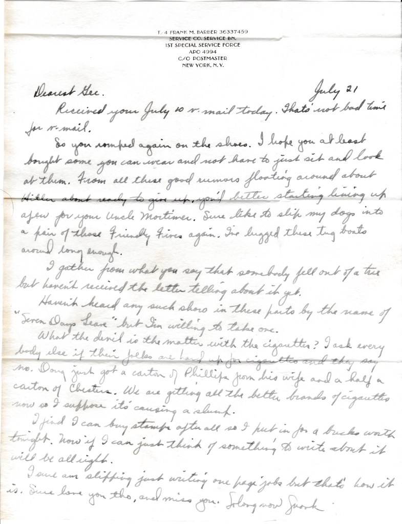 So you romped again on the shoes. I hope you at least bought some you can wear and not have to just sit and look at them. From all these good rumors floating around about Hitler about ready to give up, you’d better start lining up a few for your Uncle Mortimer. Sure like to slip my dogs into a pare of those friendly fires again. I’ve lugged these tug boats around long enough.