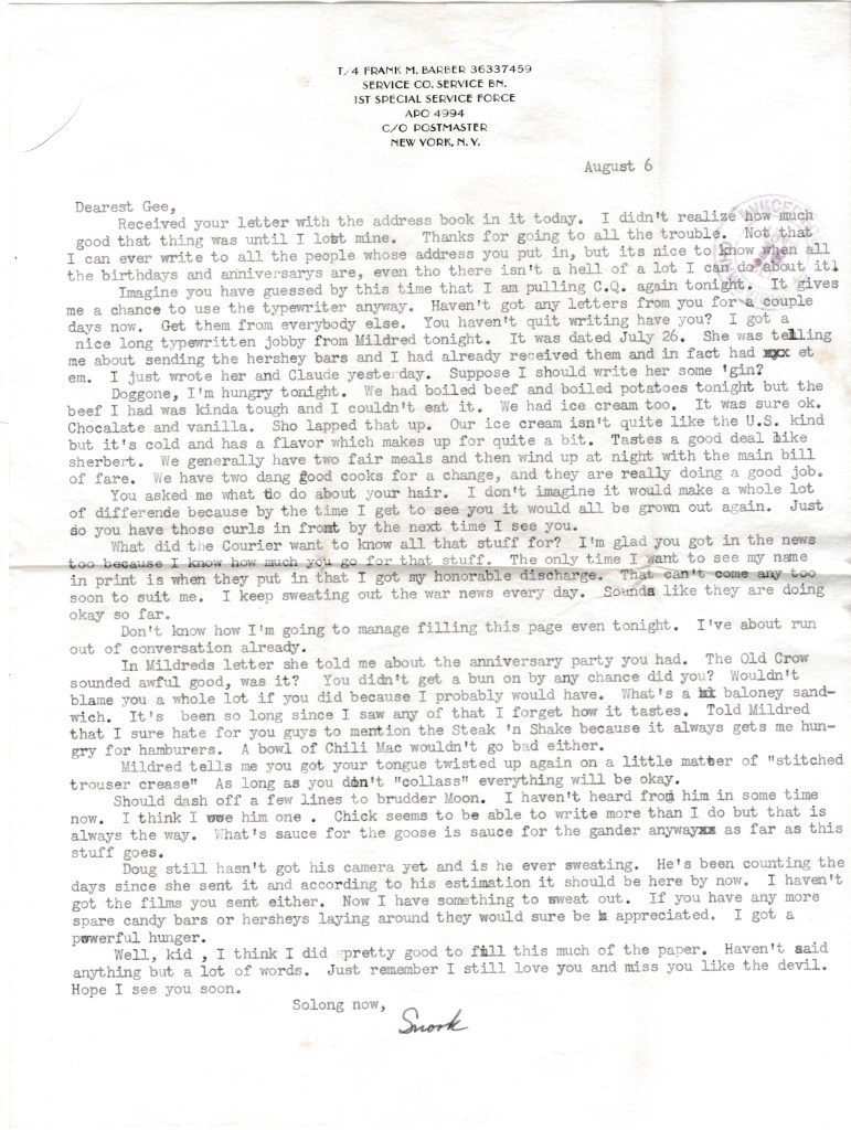Imagine you have guessed by this time that I am pulling C.Q. again tonight. It gives me a chance to use the typewriter anyway. Haven’t got any letters from you for a couple days now. Get them from everybody else. You haven’t quit writing, have you? I got a nice long typewritten jobby from Mildred tonight. It was dated July 26. She was telling me about sending the Hershey bars and I already received them and in fact had et em. I just wrote her and Claude yesterday. We had boiled beef and boiled potatoes tonight but the beef I had was kinda tough and I couldn’t eat it. We had ice cream too. It was sure ok. Chocolate and vanilla. Sho lapped that up. Our ice cream isn’t quite like the U.S. kind but it’s cold and has flavor which makes up for quite a bit. Tastes a good deal like sherbet. We generally have two fair meals and then wind up at night with the main bill of fare. We have two dang good cooks for a change, and they are really doing a good job.