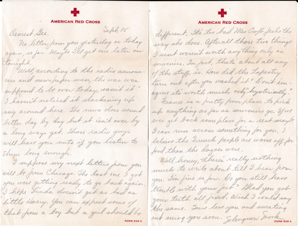 Well, according to the radio announcers and newspapermen, the war was supposed to be over today, wasn’t it? I haven’t noticed it slackening up any around here. The news does sound better day by day but it isn’t over by a long ways yet. Those radio guys will have you nuts if you listen to them long enough.