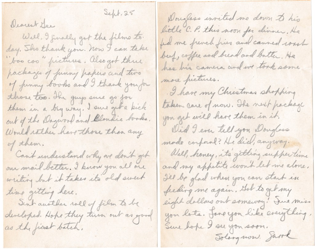 Well, I finally got the films today. Sho thank you. Now I can take “boo coo” [beaucoup] pictures. Also got three packages of funny papers and two of funny books and I thank you for those too. The guys sure go for them in a big way. I sure get a kick out of the Dagwood and Blondie books. Would rather have those than any of them.