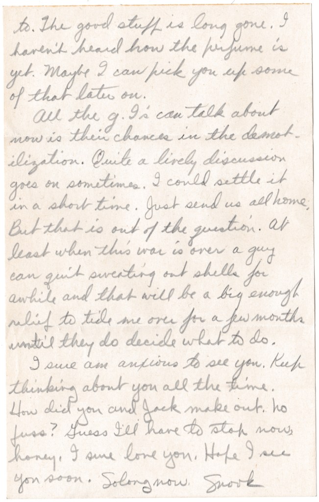 All the G.I.’s can talk about now is their chances in the demobilization. Quite a lively discussion goes on sometimes. I could settle it in a short time. Just send us all home. But that is out of the question. At least when this war is over a guy can quit sweating out shells for awhile and that will be a big enough relief to tide me over for a few months until they do decide what to do.